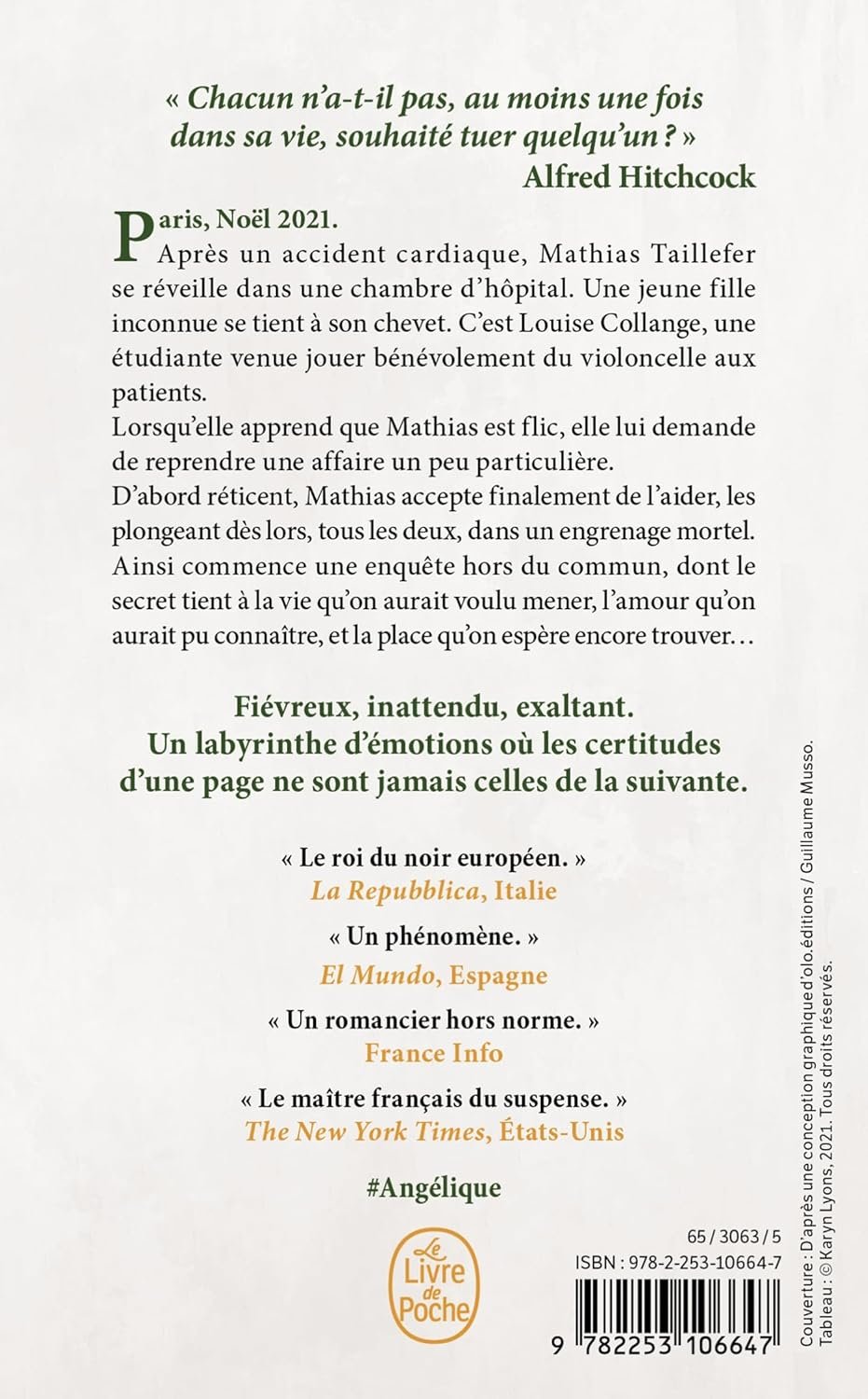 Après un accident cardiaque, Mathias Taillefer se réveille dans une chambre d’hôpital. Une jeune fille inconnue se tient à son chevet. C’est Louise Collange, une étudiante venue jouer bénévolement du violoncelle aux patients. Lorsqu’elle apprend que Mathias est flic, elle lui demande de reprendre une affaire un peu particulière. D’abord réticent, Mathias accepte finalement de l’aider, les plongeant dès lors, tous les deux, dans un engrenage mortel. Ainsi commence une enquête hors du commun, dont le secret tient à la vie qu’on aurait voulu mener, l’amour qu’on aurait pu connaître, et la place qu’on espère encore trouver…