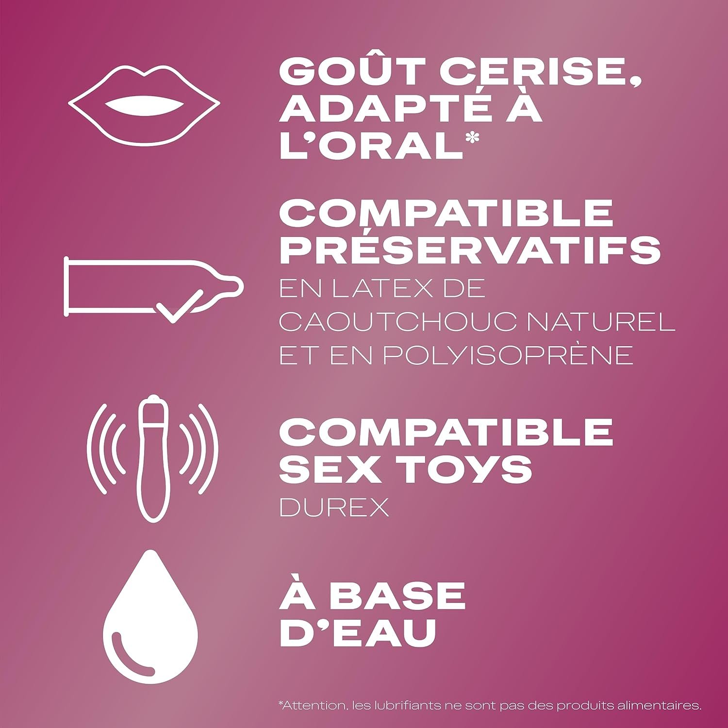 Utiliser un lubrifiant à base d’eau, comme le Durex Crazy Cherry, offre plusieurs avantages :