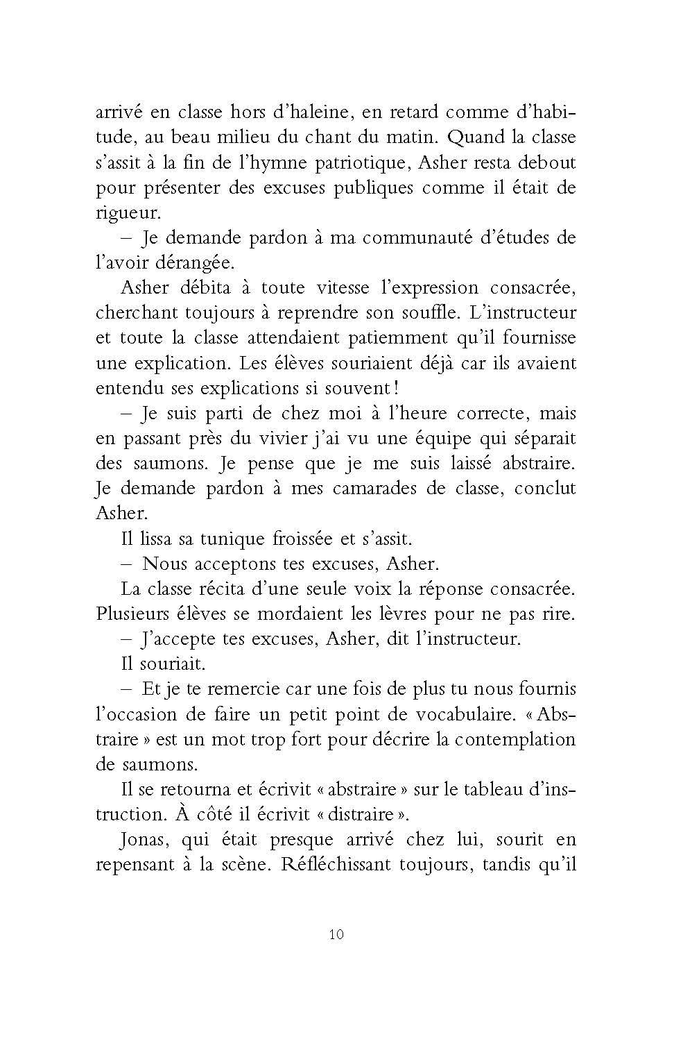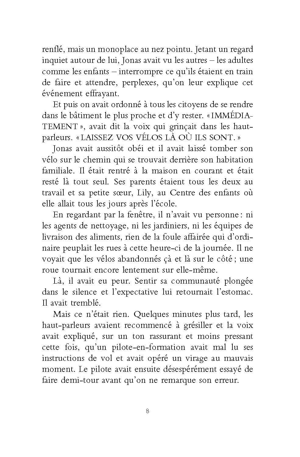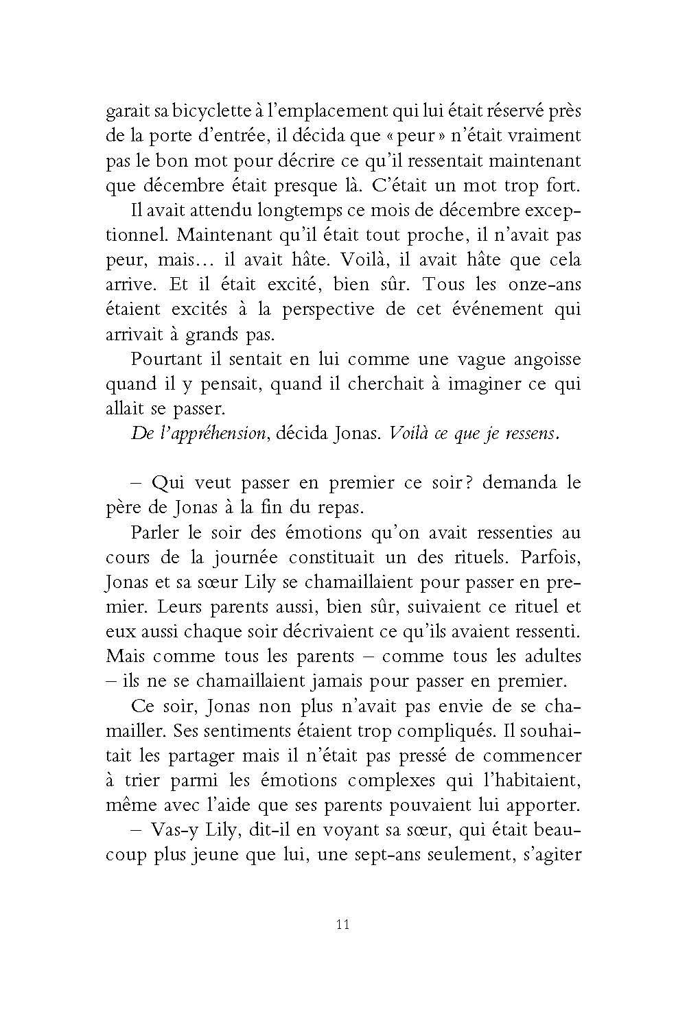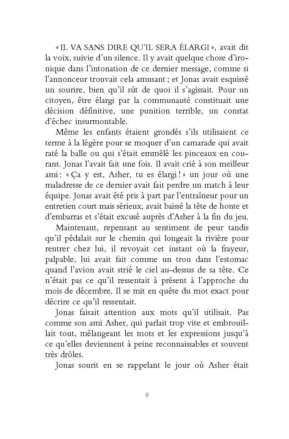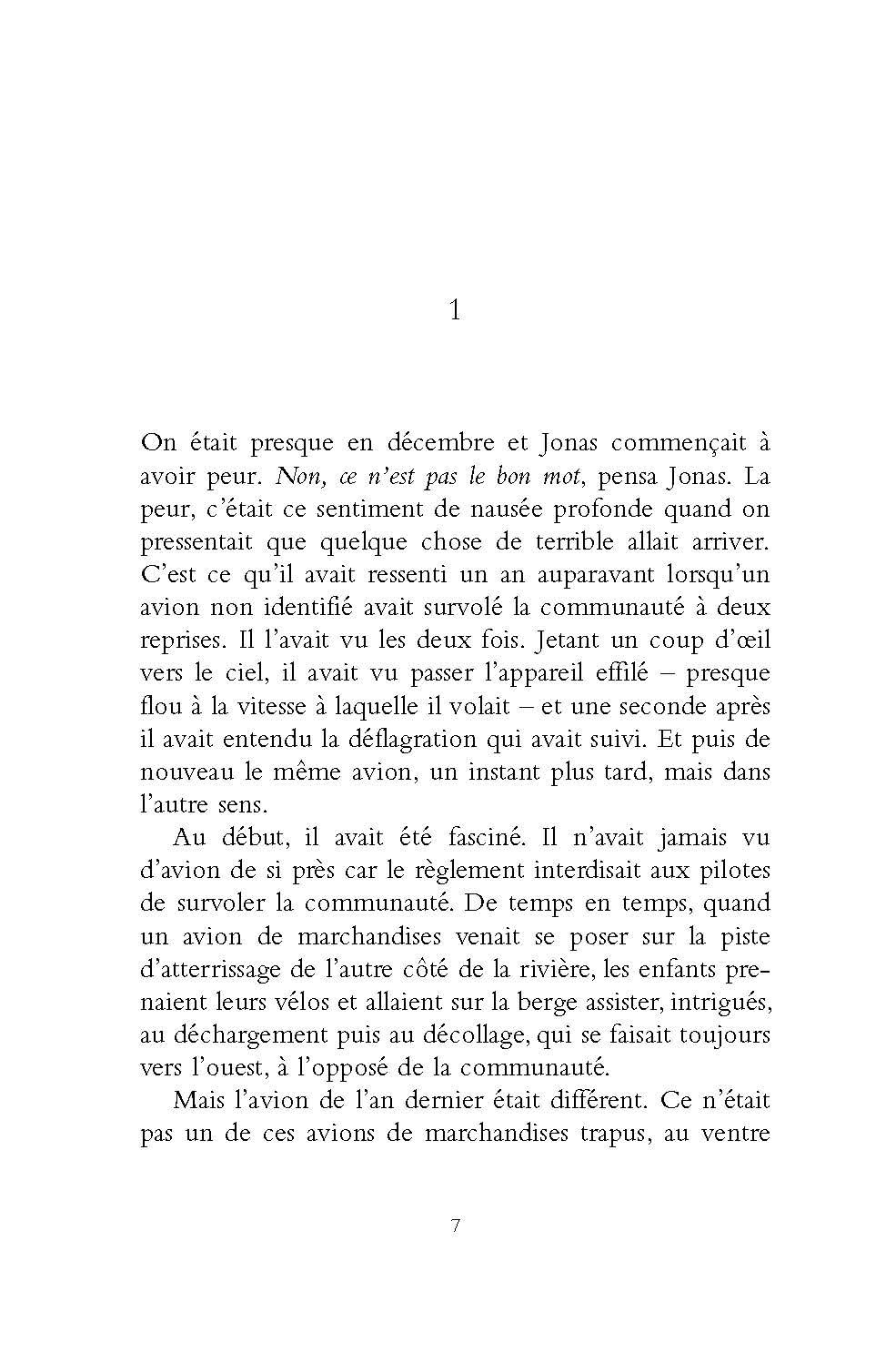 Dans le monde où vit Jonas, la guerre, la pauvreté, le chômage, le divorce n’existent pas. Les inégalités n’existent pas. La désobéissance et la révolte n’existent pas. L’harmonie règne dans les cellules familiales constituées avec soin par le comité des sages. Les personnes trop âgées, ainsi que les nouveau-nés inaptes sont « élargis », personne ne sait exactement ce que cela veut dire. Dans la communauté, une seule personne détient véritablement le savoir. Elle seule sait comment était le monde quand il y avait encore des animaux, quand l’oeil humain pouvait voir les couleurs, quand les gens tombaient amoureux. Lorsque Jonas aura douze ans, il se verra attribuer, comme tous les enfants de son âge, sa future fonction dans la communauté. Jonas ne sait pas encore qu’il est unique…